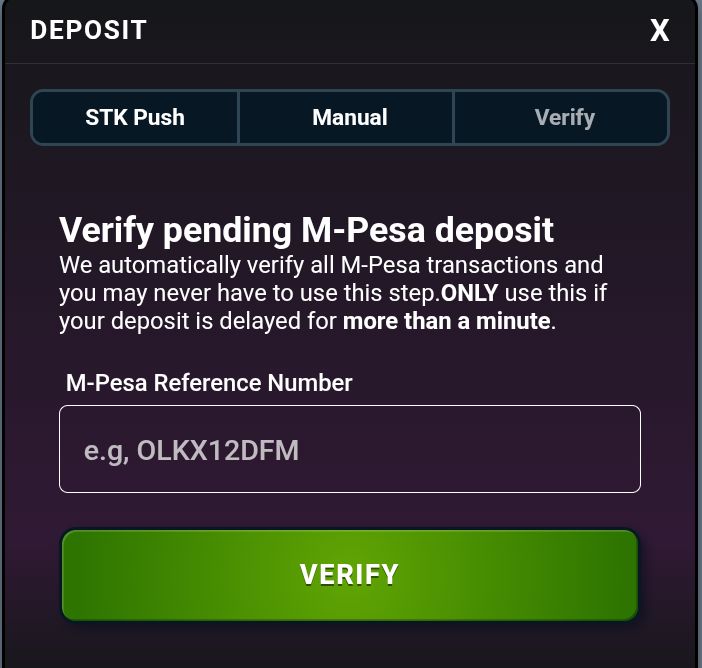 Navigate to the deposit option and choose verify option and enter the 10 digit Mpesa transaction code you received for the delayed deposit.