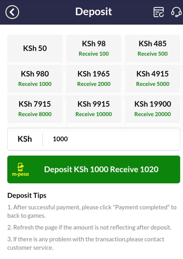 - Choose the amount you wish to deposit on the list provided or you can enter on the slot given.