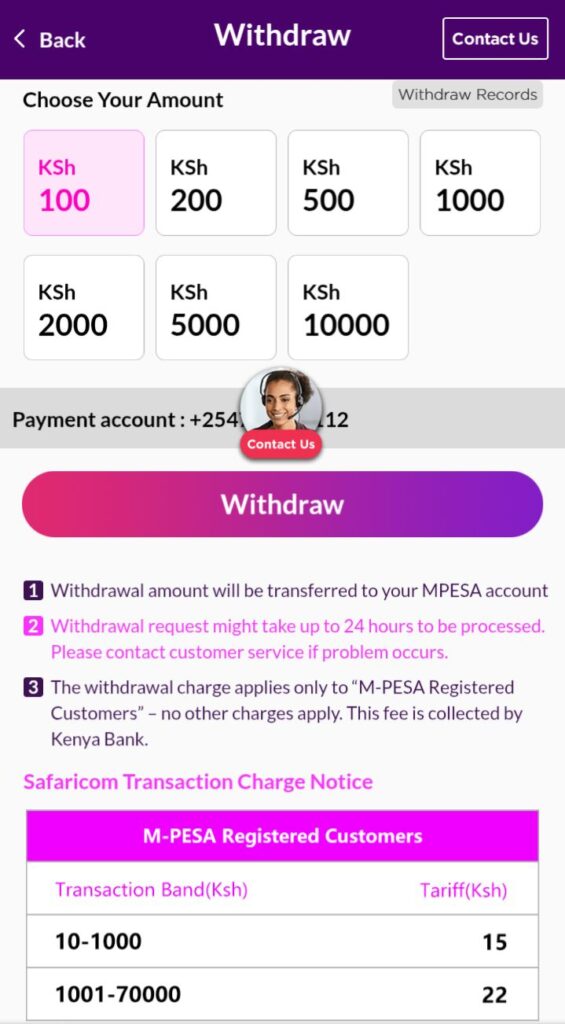 - Withdrawals are always debited to your mpesa account through the number you used during registration.