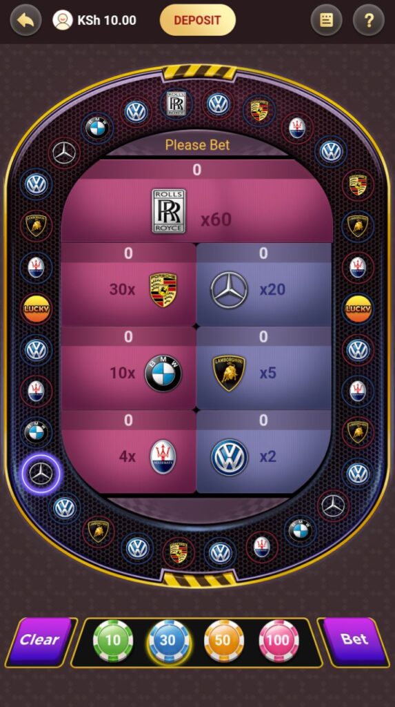 Muscle cars is a game with different car logs where each log have a multiplying odd .To Play you choose your log and bet amount then click on bet amount after some time a light will appear on one of the log.