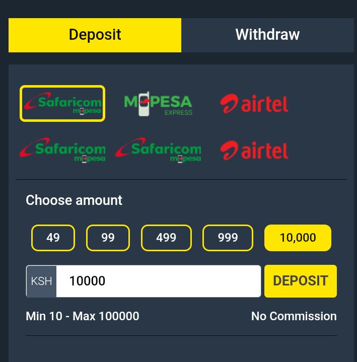 - Enter the amount you wish to deposit where the least you can deposit is ksh 10 with a maximum of ksh 100,000.